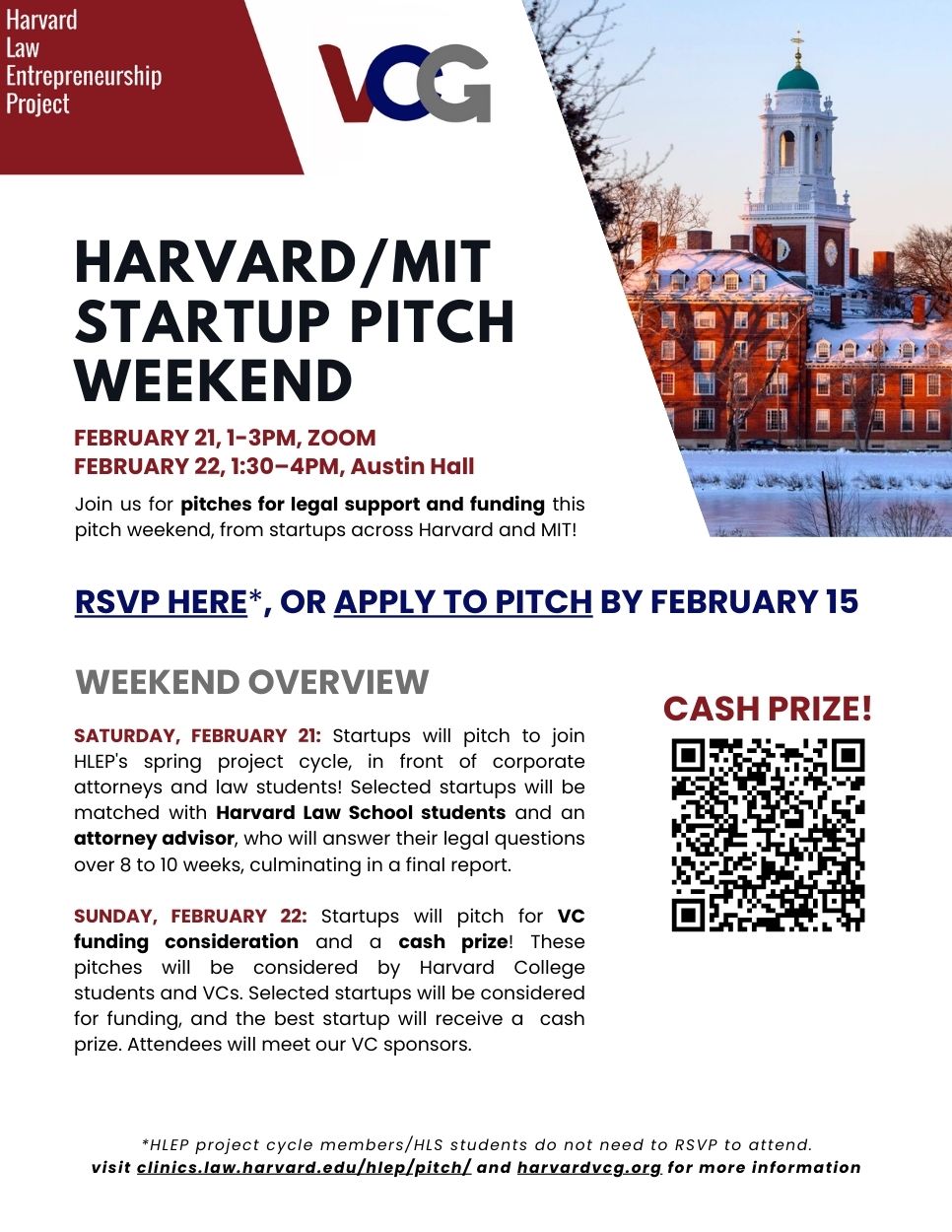 The Harvard Law Entrepreneurship Project (HLEP) is excited to partner with the Harvard Undergraduate Venture Capital Group (HUVCG) to co-host the Harvard/MIT Startup Pitch Weekend this February! This semester’s legal pitches will be held on Saturday, February 21, from 1:00–3:00pm over Zoom. VC funding pitches will be held Sunday, February 22nd, from 1:30–4:00pm at Harvard Law School, Austin Hall.